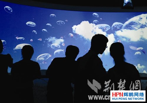 圖為:湖北館內(nèi)的桃花水母是用高科技展示的光電魅影 記者佟建國(guó)