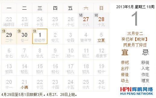 2013年放假時間:4月29日-5月1日放假調休,共3天