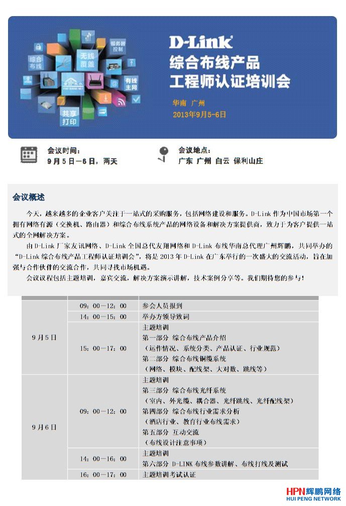 由D-Link廠家友訊網絡、D-Link全國總代友翔網絡和D-Link布線華南總代理廣州市輝澎,共同舉辦的“D-Link綜合布線產品工程師認證培訓會”,將是2013年D-Link在廣東舉行的一次盛大的交流活動,旨在加強與合作伙伴的交流合作,共同尋找市場機遇。會議議程包括主題培訓,嘉賓交流,解決方案演示講解,技術案例分享等。我們期待您的參與!