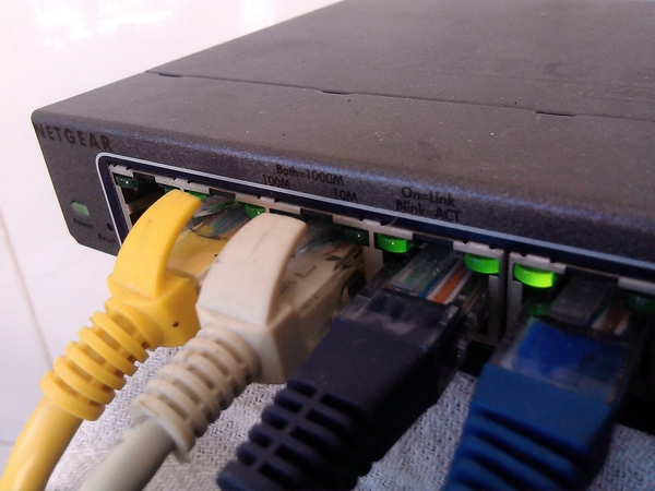 2、一些不規(guī)范的網(wǎng)線或者已經(jīng)磨損厲害的網(wǎng)線,外皮上看不到上面類似的信息,可以通過網(wǎng)絡設備的信號燈來判斷。現(xiàn)在很多網(wǎng)絡設備對于不同的網(wǎng)絡速度有不同的指示燈。如下圖,每個網(wǎng)口都有左右兩個綠燈,左邊亮表示100M速率,右邊亮表示10M的速率,兩個都亮表示連接的是1000M的設備。當然,交換機、網(wǎng)線、跟交換機連接的設備都支持1000M,這個1000M才會亮。如果你沒有千兆設備,這個方法就無從判斷了。